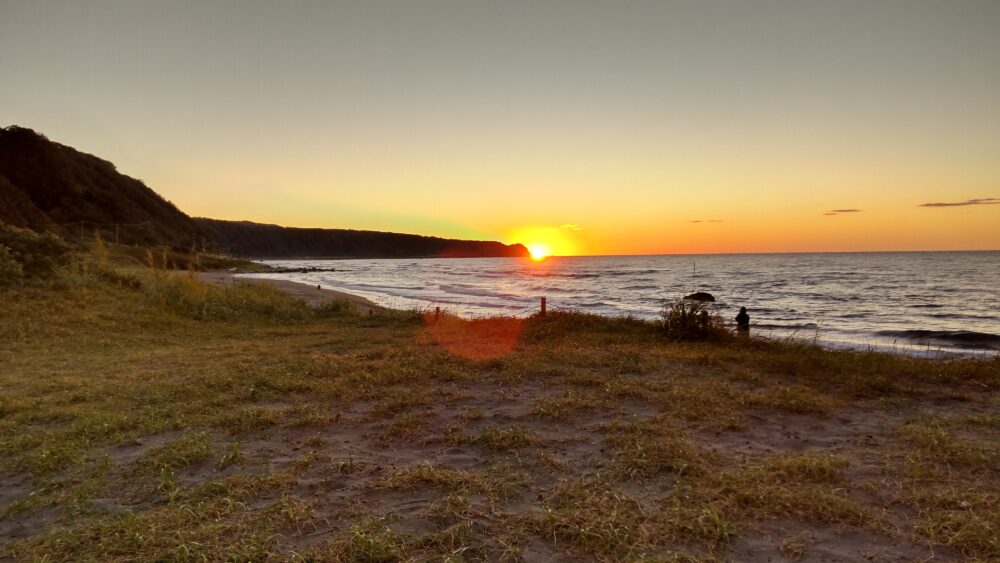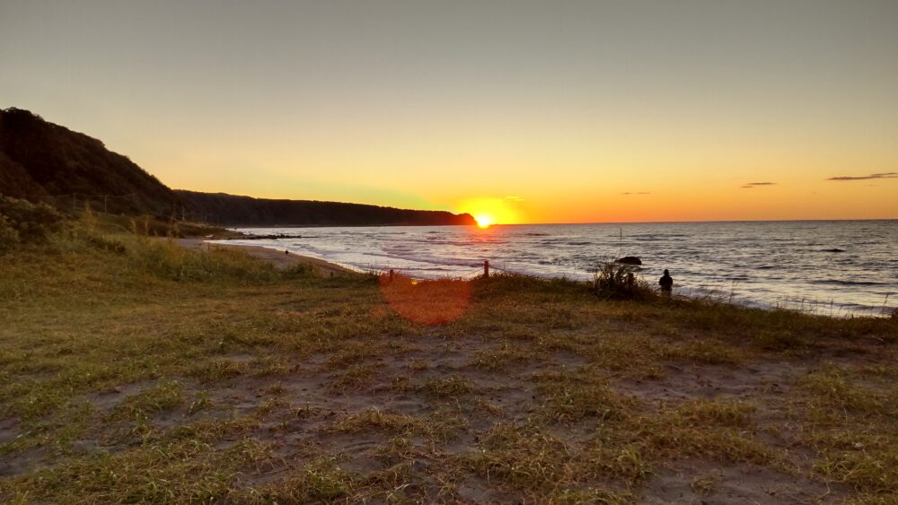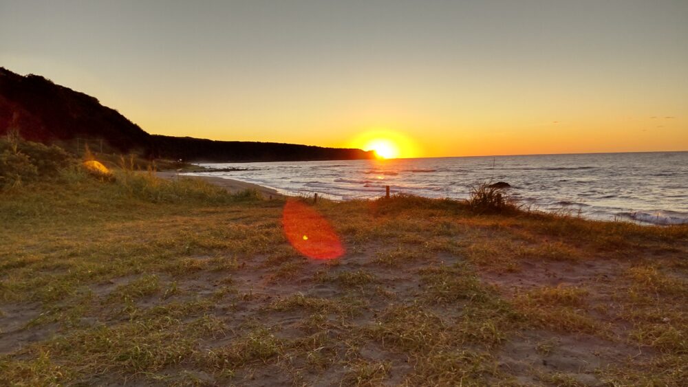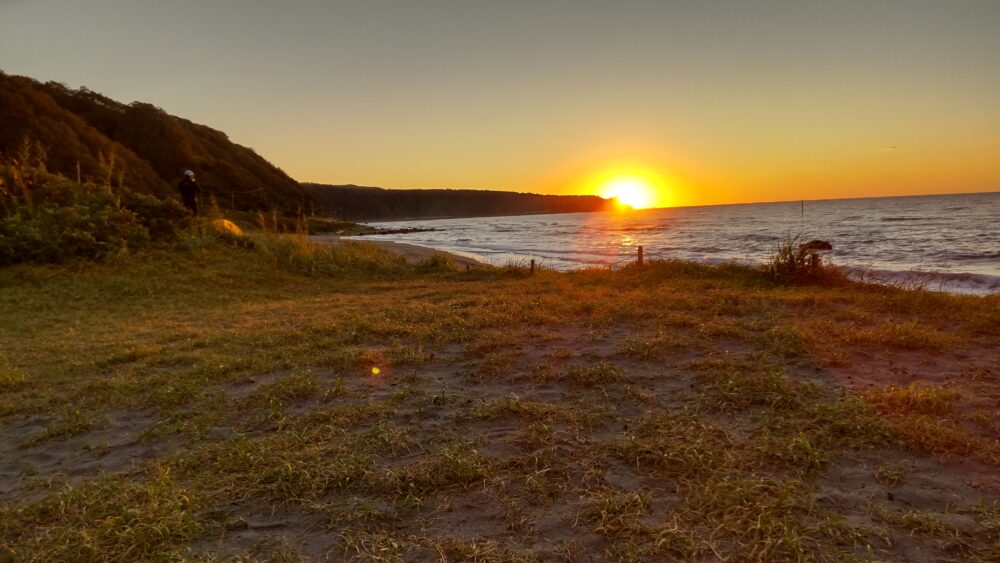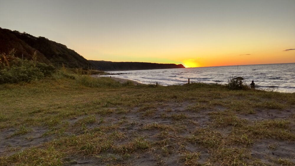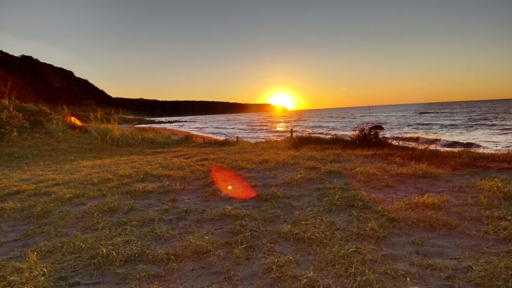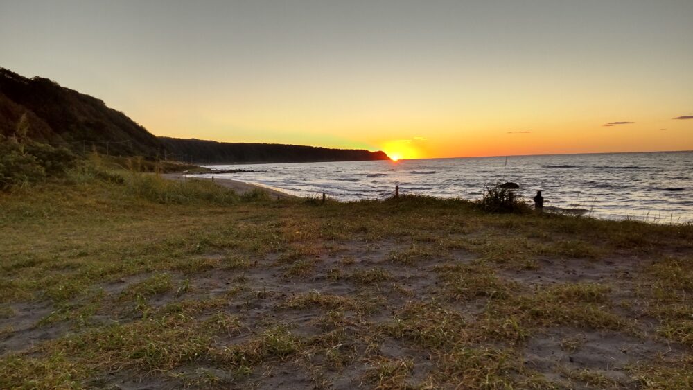 浜辺のキャンプ場から、海岸線に沈む太陽がきれい。