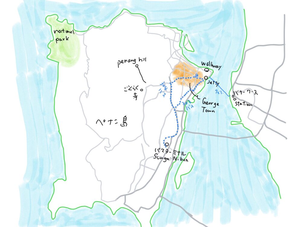 スンガイ・ニボンのバスターミナルの南側の道路にあるバス停で、303か304のバスに乗れば、ジョージタウンに到着します。